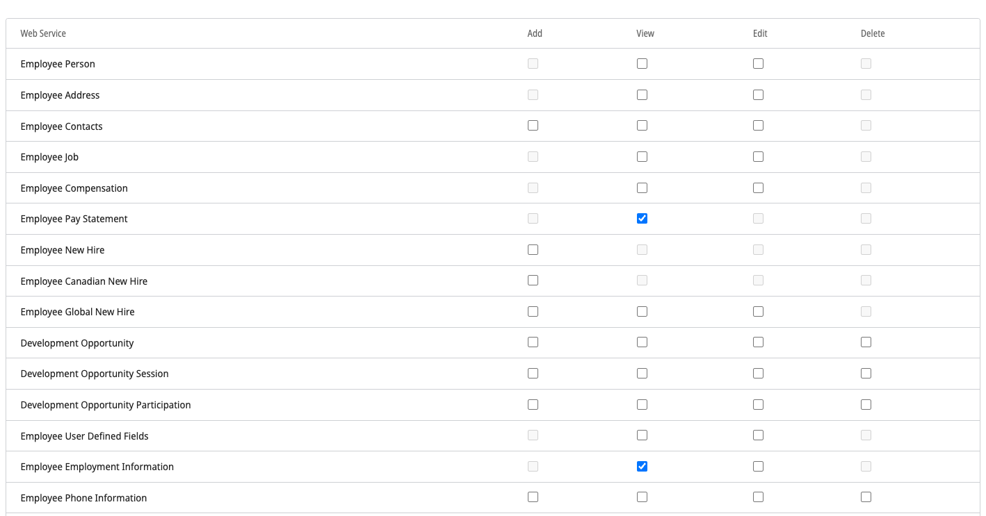 On the same page, scroll down under Web Service to enable "View Employee Person Details". This is REQUIRED.
