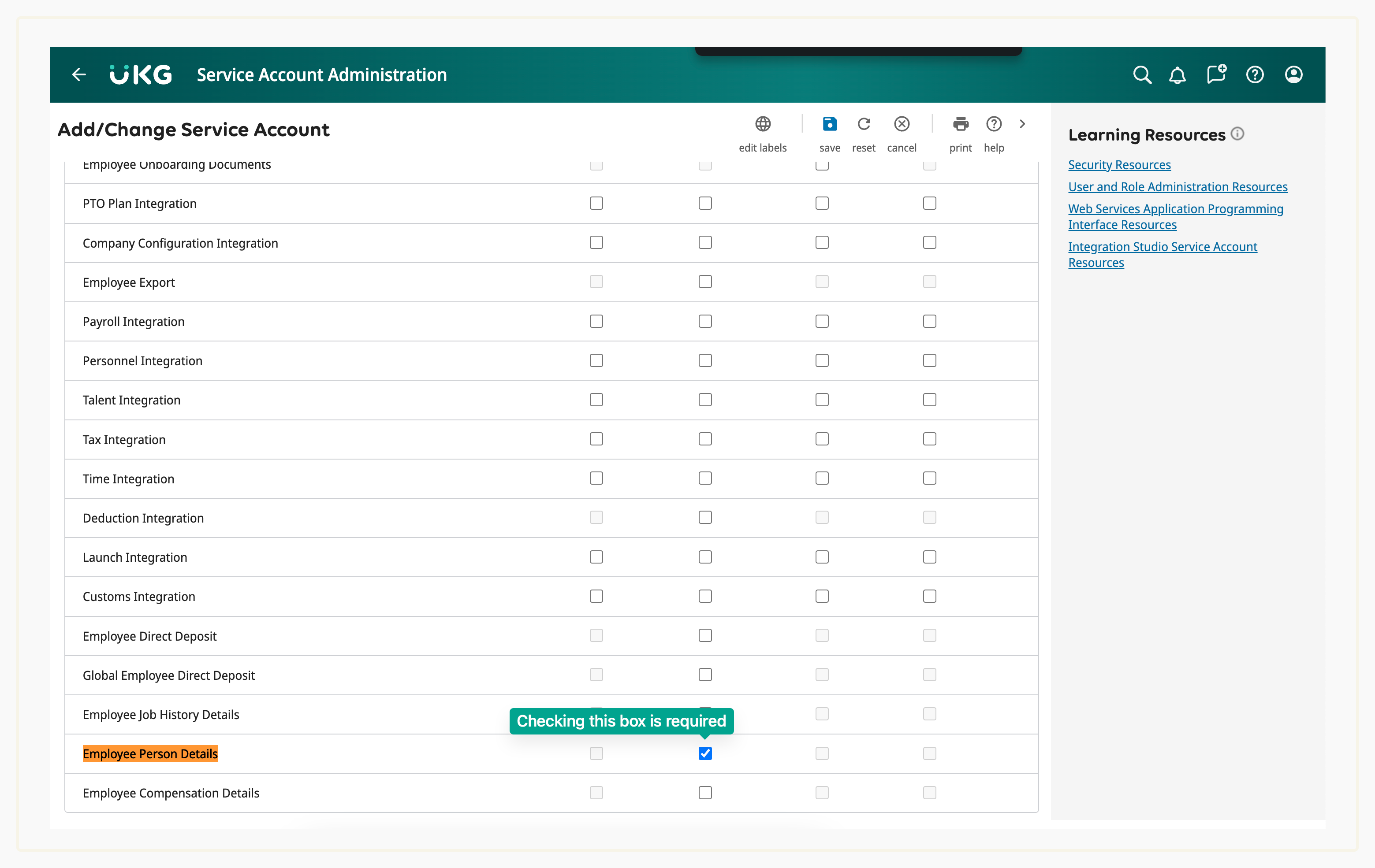 On the same page, scroll down under Web Service to enable "View Employee Person Details". This is REQUIRED.